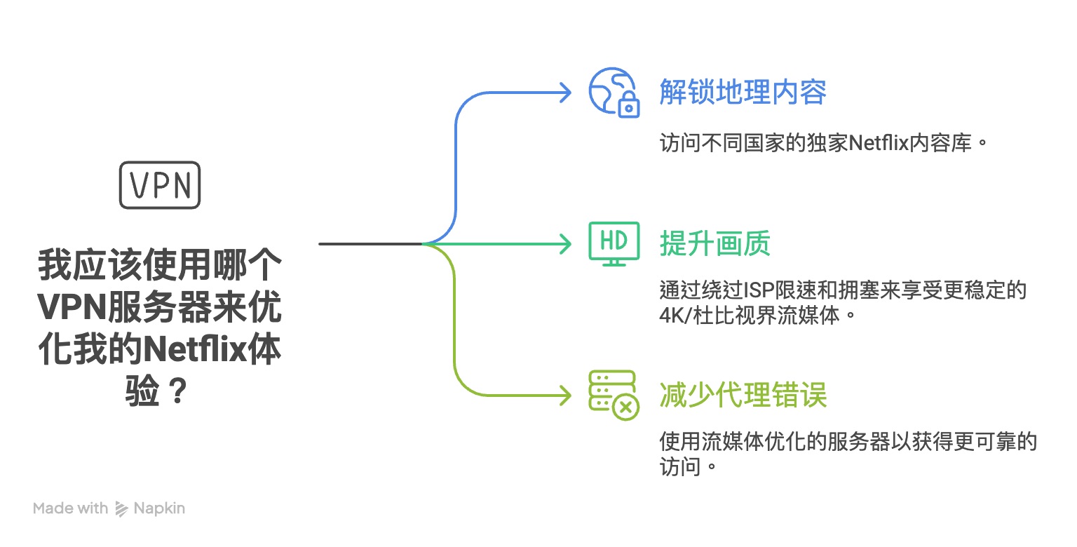 不是每台VPN服务器都能看Netflix。使用带有“流媒体专用/解锁优化/住宅IP池”的节点,更容易持续可用。